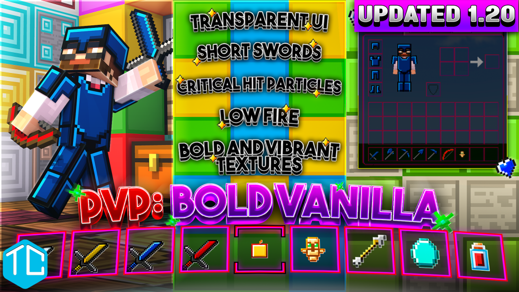 The PvP pack you have been waiting for!!! Bold and vibrant textures with features that are designed for PvP. A pack created using your comments and feedback, apply it in your own world or any server. Features: – Short swords – Low fire – Transparent UI – Clear chat – Critical hit particles – Highlighted and animated ores – Small food items |
